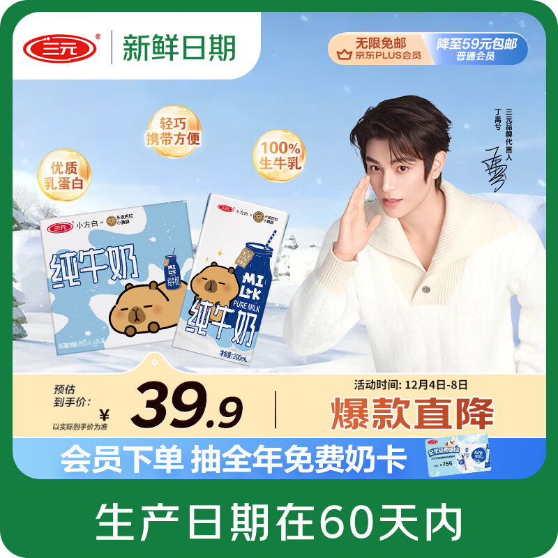 包邮 三元【新鲜日期】小方白纯牛奶200ml*24盒 100%生牛乳